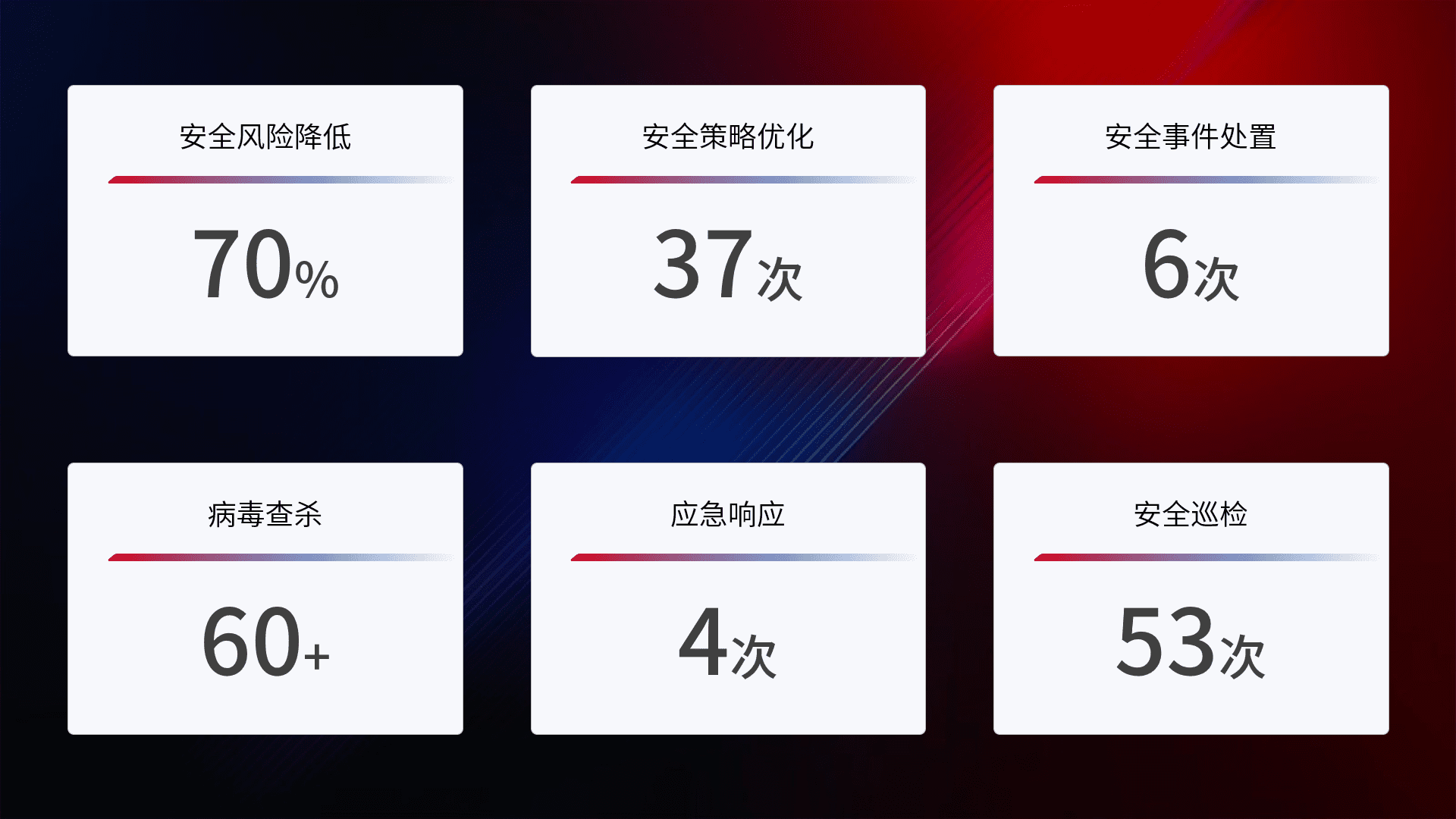 提供全面的安全事件报告体系,,,,包括处置报告、、周报、、、季度和年度总结,,,结合持续监控,,,帮助客户深入了解网络安全状况。。。。